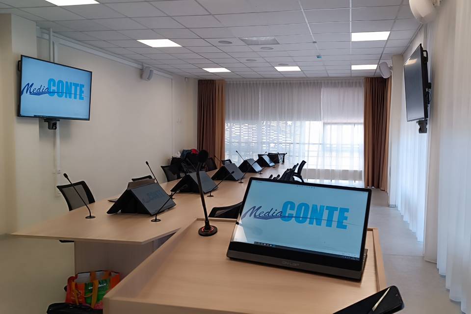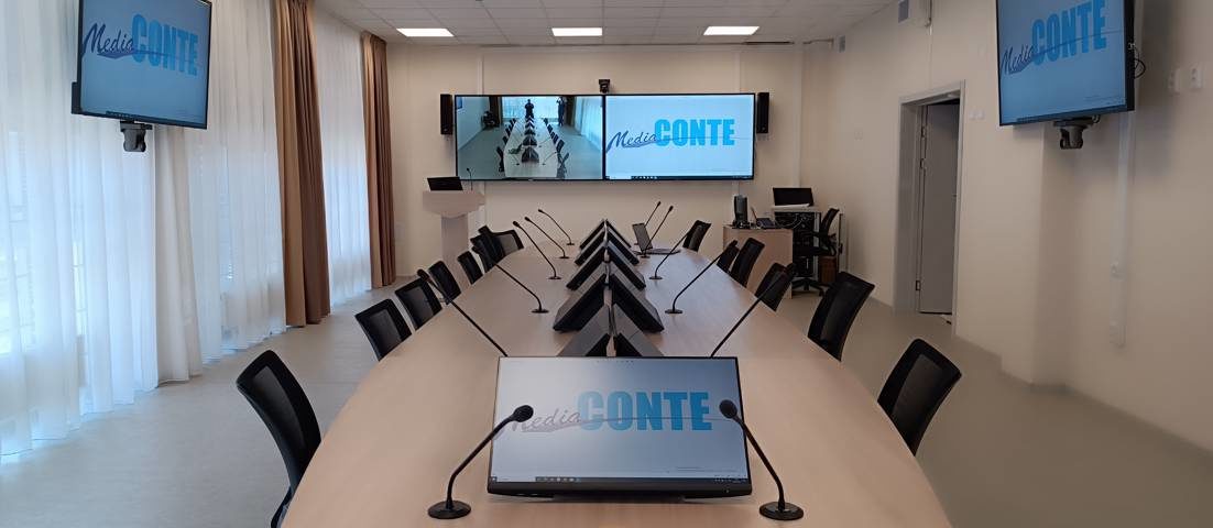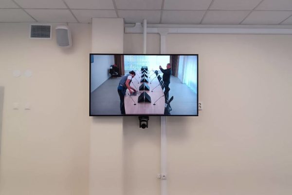 3. Персональные мониторы делегатов: На столе совещаний установлены 10 мониторов диагональю 21,5″ на специальных настольных кронштейнах. Кронштейны не только скрывают коммуникации, но и располагают экраны под углом 45 градусов, обеспечивая удобный обзор и не закрывая визуальный контакт между участниками.