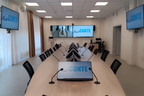 Нашей компанией был реализован проект по созданию аппаратно-программного мультимедийного комплекса для оснащения зала совещаний в ГБПОУ «Пермский авиационный техникум им. А.Д. Швецова». Главной задачей было обеспечить проведение мероприятий с большим количеством участников: размещение за центральным столом до 20 делегатов, возможность выступления с места, оборудованное место докладчика и полноценная видеоконференцсвязь.