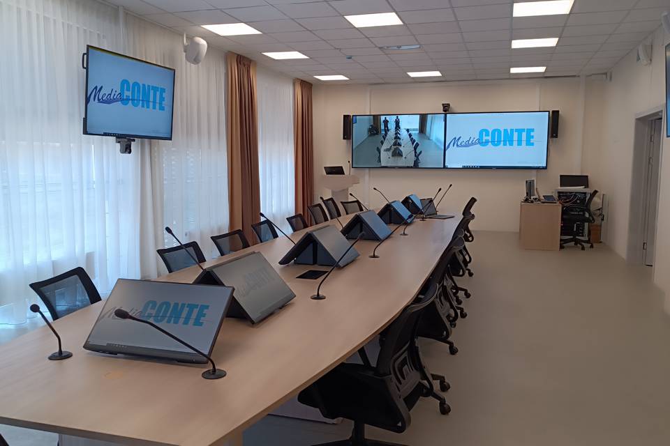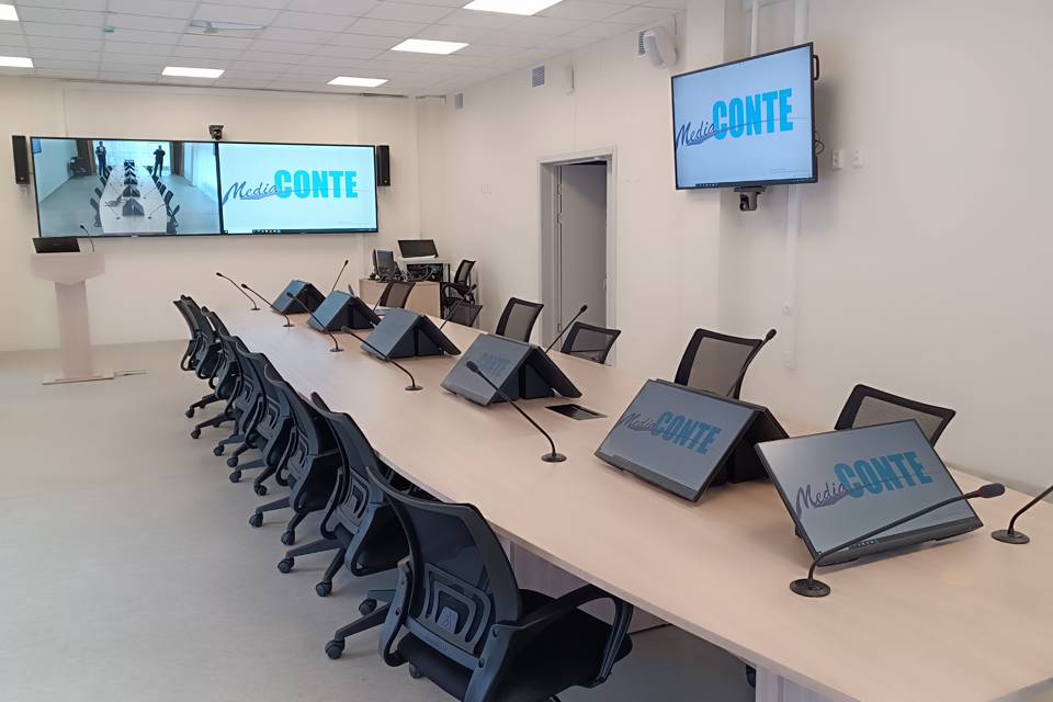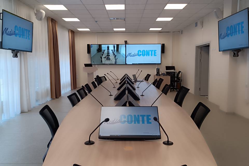 • Система звукоусиления построена по комбинированному принципу: 6 пассивных акустических систем настенного исполнения отвечают за основную направленность звука, а 10 потолочных акустических систем создают равномерный фоновый звук по всему объему помещения. Это обеспечивает идеальную разборчивость речи как для участников за столом, так и для гостей на дополнительных местах.