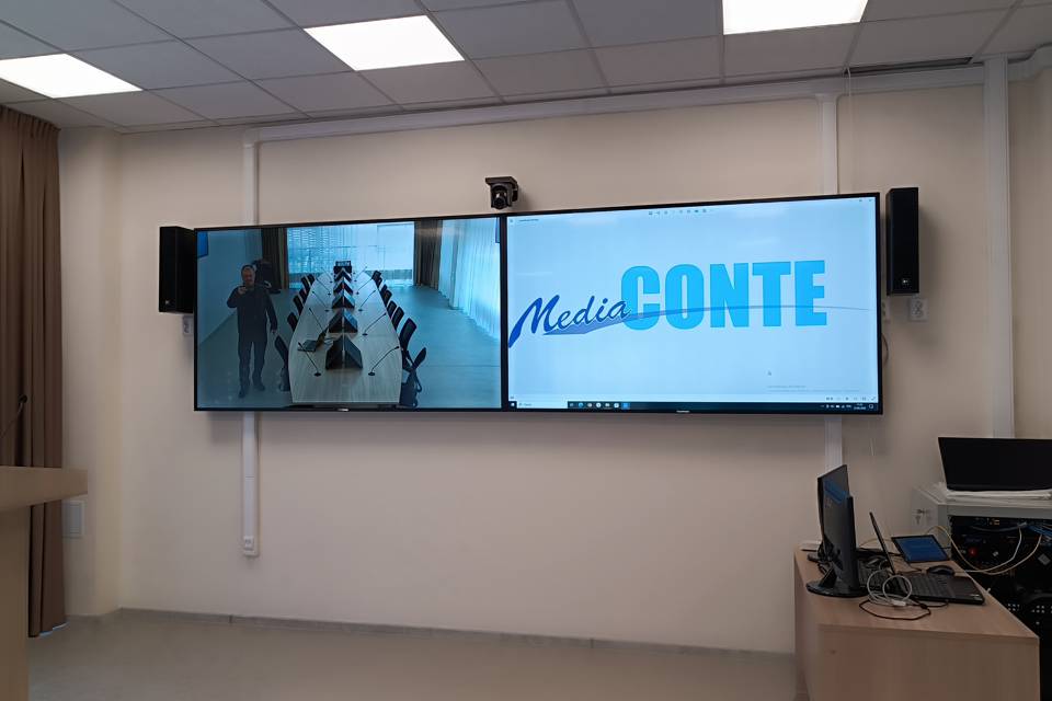 1. Основные экраны: Две профессиональные ЖК-панели диагональю 86 дюймов, установленные стационарно напротив головной части стола президиума. Они служат главным носителем презентационной информации.
