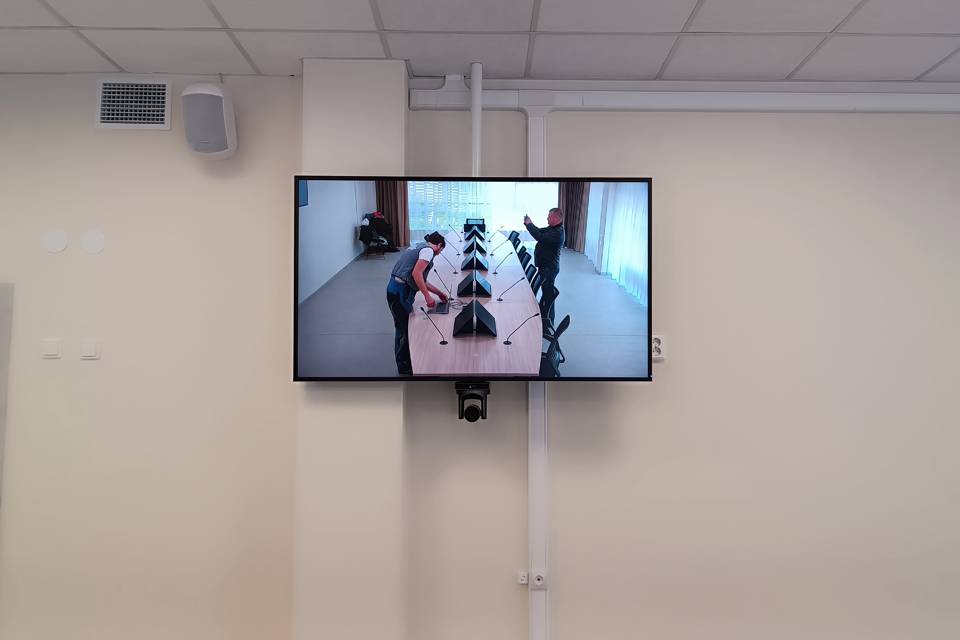 Для проведения видеоконференцсвязи, а также записи и трансляции мероприятий в зале установлены три поворотные PTZ-камеры. Они могут управляться оператором вручную или автоматически наводиться на активный микрофон при выступлении делегатов с мест.