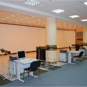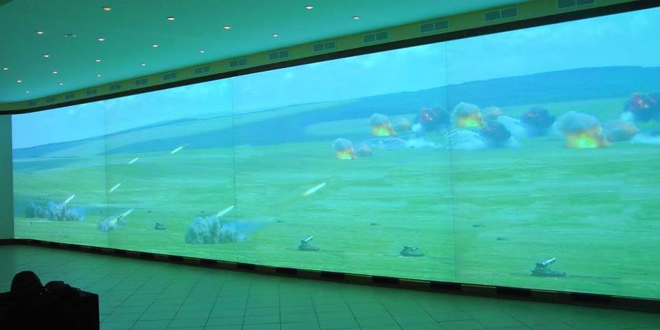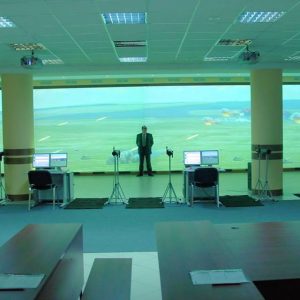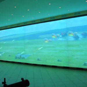 Комплекс представляет собой проекционный экран размером 12 м х 3 м, на который выводится изображение с 8 мультимедиа проекторов. На экране движутся цели, которые должны поразить курсанты.